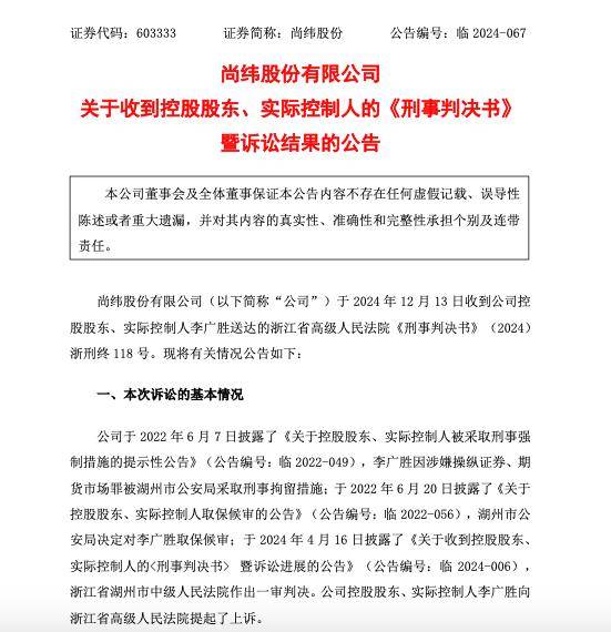 3、被告人李广胜二审期间退缴的违法所得100万元予以没收★,上缴国库;不足部分继续追缴,上缴国库。 公告称,公司于2024年12月13日收到公司控股股东、实际控制人李广胜送达的浙江省高级人民法院《刑事判决书》(2024)浙刑终118号★。 10月15日,尚纬股份发布三季度报告★。公告显示,公司前三季度营业收入1,197★,547★,176.14元,同比减少25★.34%,归属上市公司股东的净利润18,997,581.53元,同比减少37.32%★。 “作为公司独立董事,本着严格尽职履责的态度,高度重视公司被占用资金的追偿进展以及公司规范运作情况。”12月11日,尚纬股份独立董事共同提交函件,督促李广胜应尽快归还所占用资金,制定具体的还款计划,明确还款方式、时间节点及保障措施,并严格履行★。 公司董事会同意提名盛业武★、沈智飞、为公司董事会董事候选人,任期为公司股东大会审议通过之日起至第五届董事会任期届满时止。公司董事会同意聘任盛业武为公司总经理★,任期自本次董事会审议通过之日起至第五届董事会任期届满之日止★。 公司于2022年6月7日披露了《关于控股股东、实际控制人被采取刑事强制措施的提示性公告》(公告编号:临2022-049),李广胜因涉嫌操纵证券、期货市场罪被湖州市公安局采取刑事拘留措施;于2022年6月20日披露了《关于控股股东★、实际控制人取保候审的公告》(公告编号:临2022-056),湖州市公安局决定对李广胜取保候审;于2024年4月16日披露了《关于收到控股股东、实际控制人的刑事判决书暨诉讼进展的公告》(公告编号★:临2024-006),浙江省湖州市中级人民法院作出一审判决。公司控股股东★、实际控制人李广胜向浙江省高级人民法院提起了上诉。 公告表示,上述董事的辞任不会导致公司董事会成员人数低于法定最低人数,不会对公司董事会及公司的正常运作产生重大影响。 公开资料显示,李广胜现年51岁,系尚纬股份董事长、总经理、法定代表人和董事。据公司此前公告,2016年6月,因犯单位行贿罪、行贿罪和虚开增值税专用发票罪,数罪并罚,李广元被宜昌市中级人民法院判处有期徒刑11年。李广胜与李广元为兄弟关系★。 11月30日,尚纬股份披露整改报告★,其中包括敦促实际控制人归还被占用资金★,称已收到李广胜签署的《通知函》,其承诺将尽快筹措资金,以分期还款的方式向公司偿还占用资金。 尚纬股份称★,公司董事会收到独立董事《督促函》后高度重视★,已成立专门工作小组开展占用资金的追回工作★。公司将认真落实独立董事《督促函》的各项要求。 12月15日★,尚纬股份有限公司(以下简称★“尚纬股份”或★“公司★”)发布关于收到控股股东、实际控制人的《刑事判决书》暨诉讼结果的公告★。 此前,与李广胜同时被宣判的还有尚纬股份时任董秘姜向东★。其因犯操纵证券市场罪,被判处有期徒刑三年★,缓刑四年,并处罚金10万元★。