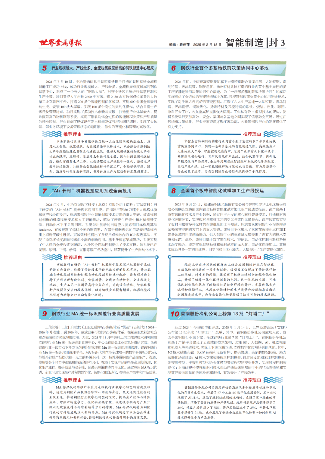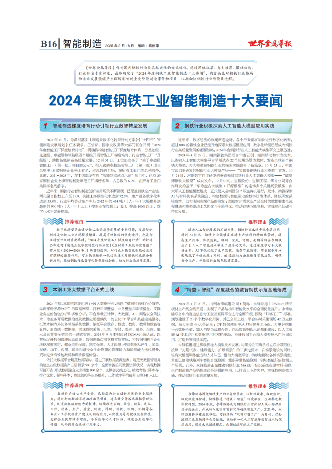 经过2024年冬季的申报评选,2025年1月14日,世界经济论坛(WEF)公布第13批全球“灯塔工厂”名单★,其中,首钢股份冷轧公司成功入选,成为全国钢铁行业第3家、全球钢铁行业第7家“灯塔工厂”★。首钢股份冷轧公司基于产销平台建设了云边端的技术架构★,应用5G、大数据、AI、机器视觉和机器人等先进技术,实现上下游互联互通,支撑数字化应用场景的落地★。其中,5G技术赋能仓储★、RGV运输和设备管控,提供快速★、稳定的数据传输,助力智能化场景建设★;AI技术支撑智能板形控制模型、锌层预设定和闭环控制模型、光整机模型★、平整机模型和合金化模型等过程控制模型开发,实现过程控制智能化;上海研视科技视觉识别技术帮助产线快速感知运行中的非稳态情况和实现镀锌表面质量的快速检测和识别,有效提升了产线效率。 中冶赛迪信息携手日照钢铁在统一工业互联网架构基础上,应用人工智能、机器视觉、大数据算法等先进技术,充分融合日照钢铁生产管理经验及已有信息化建设成果,让超大规模铁区精细化生产管控成为现实,在规模、集成度上创造行业之最,纵向打通数据传送链路,横向贯通各生产工序,以数据驱动生产操控管一体化,推动生产效率持续提高,打造行业智能制造标杆示范工厂★,创造钢铁智慧★、绿色★、高质量转型发展新实践,书写新质生产力驱动创新发展新篇章。 工信部等十二部门印发的《工业互联网标识解析体系★“贯通★”行动计划(2024—2026年)》提出,到2026年,建成自主可控的标识解析体系★,在制造业及经济社会重点领域初步实现规模应用★。为此,2024年11月中关村工信二维码技术研究院成立钢铁行业MA统一标识注册管理中心,中心设在冶金工业信息标准研究院,负责钢铁行业一级节点下各类节点的分配管理和MA统一标识的注册管理,建设钢铁行业MA统一标识注册管理平台★。MA标识代码作为全球唯一的数字身份标识代码★,能够为钢铁产品提供独一无二的身份识别★。这一特性使得钢铁产品在生产、流通、使用等各个环节中都能被准确追踪和识别,有助于实现产品的全生命周期管理,优化生产流程★,提升质量与安全性,促进供应链的协同与优化★。通过应用MA标识代码★,企业可以实现生产过程的数字化、智能化和自动化,提高生产效率和产品质量。 《世界金属导报》作为国内钢铁行业最具权威性的专业媒体,通过网络征集、自主推荐、报社初选、行业知名专家评选,最终确定了★“2024年度钢铁工业智能制造十大要闻★”,内容涵盖对钢铁行业格局和未来发展能够产生深远影响的重要智能制造事件和项目★,以期加快钢铁行业智能化进程★。